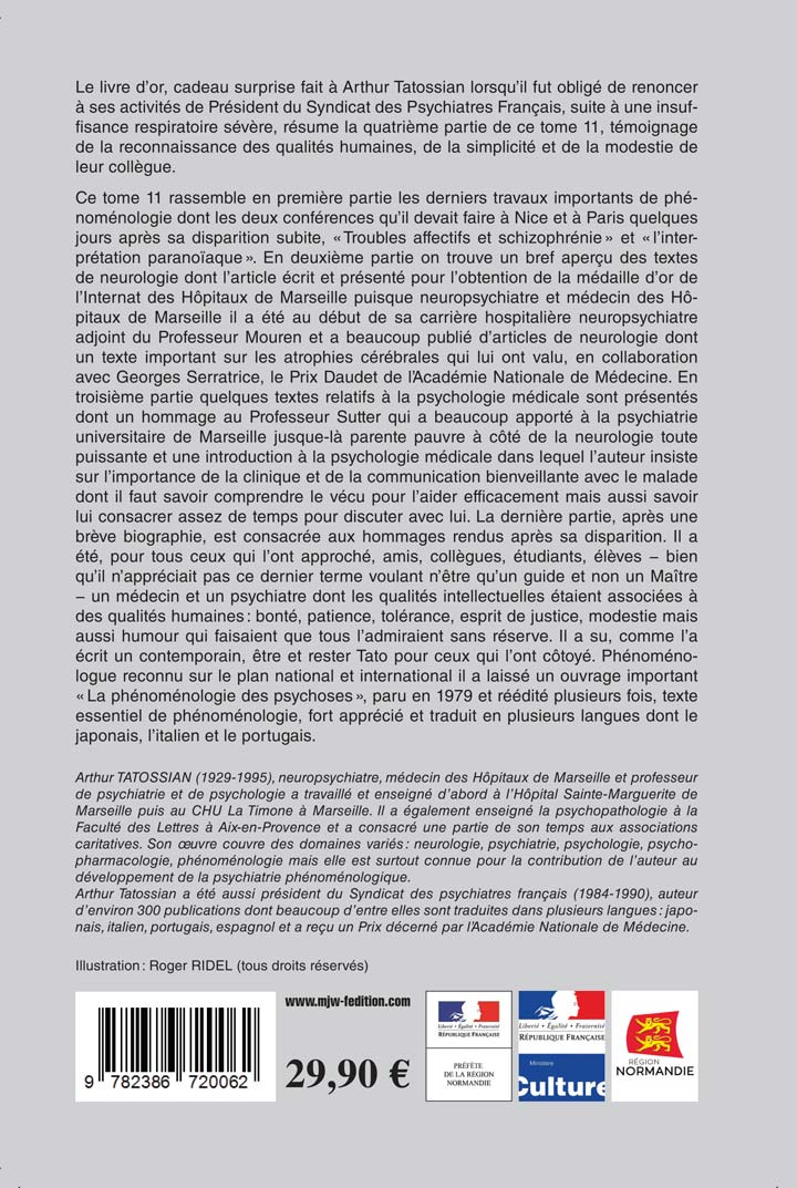 Ce tome 11 rassemble en première partie les derniers travaux importants de phénoménologie dont les deux conférences qu’il devait faire à Nice et à Paris quelques jours après sa disparition subite, « Troubles affectifs et schizophrénie » et « l’interprétation paranoïaque ». En deuxième partie on trouve un bref aperçu des textes de neurologie dont l’article écrit et présenté pour l’obtention de la médaille d’or de l’Internat des Hôpitaux de Marseille puisque neuropsychiatre et médecin des Hôpitaux de Marseille il a été au début de sa carrière hospitalière neuropsychiatre adjoint du Professeur Mouren et a beaucoup publié d’articles de neurologie dont un texte important sur les atrophies cérébrales qui lui ont valu, en collaboration avec Georges Serratrice, le Prix Daudet de l’Académie Nationale de Médecine. En troisième partie quelques textes relatifs à la psychologie médicale sont présentés dont un hommage au Professeur Sutter qui a beaucoup apporté à la psychiatrie universitaire de Marseille jusque-là parente pauvre à côté de la neurologie toute puissante et une introduction à la psychologie médicale dans lequel l’auteur insiste sur l’importance de la clinique et de la communication bienveillante avec le malade dont il faut savoir comprendre le vécu pour l’aider efficacement mais aussi savoir lui consacrer assez de temps pour discuter avec lui. La dernière partie, après une brève biographie, est consacrée aux hommages rendus après sa disparition. Il a été, pour tous ceux qui l’ont approché, amis, collègues, étudiants, élèves – bien qu’il n’appréciait pas ce dernier terme voulant n’être qu’un guide et non un Maître – un médecin et un psychiatre dont les qualités intellectuelles étaient associées à des qualités humaines : bonté, patience, tolérance, esprit de justice, modestie mais aussi humour qui faisaient que tous l’admiraient sans réserve. Il a su, comme l’a écrit un contemporain, être et rester Tato pour ceux qui l’ont côtoyé. Phénoménologue reconnu sur le plan national et international il a laissé un ouvrage important « La phénoménologie des psychoses », paru en 1979 et réédité plusieurs fois, texte essentiel de phénoménologie, fort apprécié et traduit en plusieurs langues dont le japonais, l’italien et le portugais.